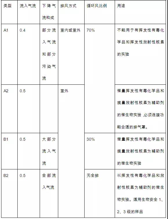 Ⅱ級安全柜按排放氣流占系統(tǒng)總流量的比例及內(nèi)部設(shè)計結(jié)構(gòu)分為A1、A2、B1、B2四種類型。